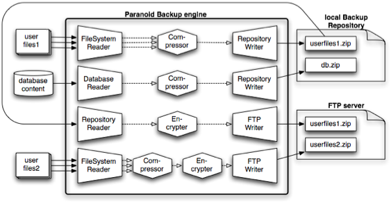 This scenario demonstrates how a complex backup task is split into several simple successive operations. Lets say we want to backup the contents of two different folders and one database. The folders’ backups should be replicated onto an external FTP server. The local backups (i.e. the ones in the backup repository) should be compressed. Once they are transferred to another computer, they should also be encrypted. Since folder 2 is very large, we only want to put it onto the FTP server and not keep it in the local backup repository, because we are a little low on hard disk space already ;-)