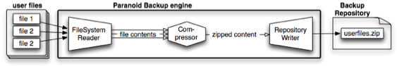 This scenario extends scenario 1 by transforming the backup data stream before it is written into the backup repository. The most common transformation is to compress the backup stream in order to save space on the backup medium. Hence we pipe the data stream coming from the FileSystemReader module through a Compressor module, and provide the output of this compressor to the RepositoryWriter. After the backup is done, the backup repository contains a single zip file containing all the user's files.